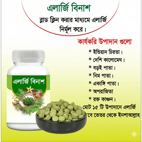 প্রকৃতির নির্যাস থেকে, পবিত্র কোরআন, হাদিস এবং আধুনিক বিজ্ঞানের প্রমাণিত ফর্মুলার ওপর ভিত্তি করে তৈরি আমাদের এই বিশেষ ভেষজ মিশ্রণটি আপনার অ্যালার্জি এবং ত্বকের সমস্যা সমাধানে এক নতুন দিগন্ত উন্মোচন করবে।